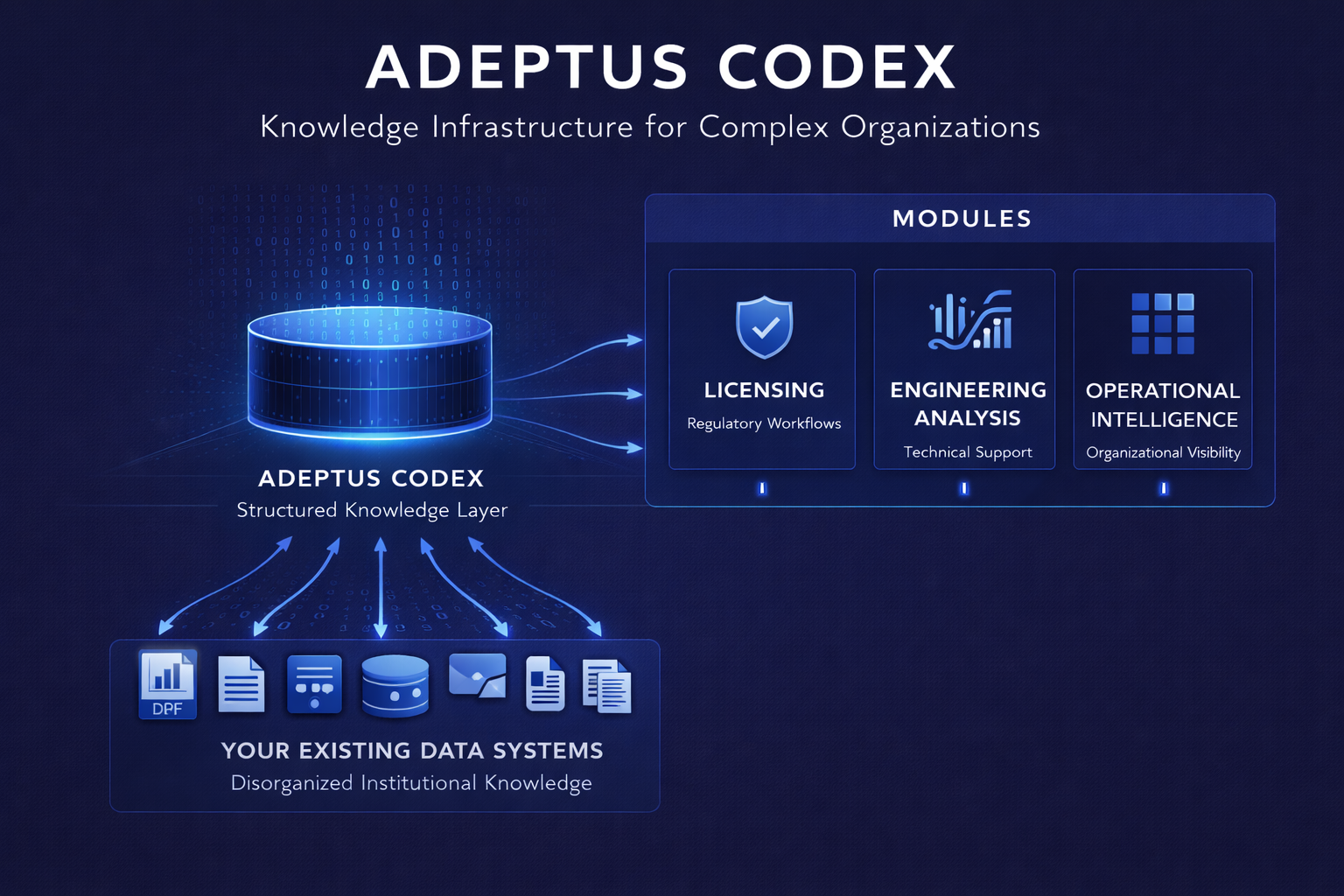 Organizations in regulated industries generate enormous amounts of knowledge across engineering reports, calculations, regulatory filings, technical analyses, and internal documentation. Over time, that knowledge becomes difficult to find, connect, and reuse. Adeptus organizes this information into a structured knowledge layer called Codex.
